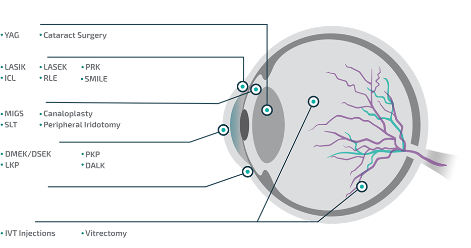 DALK=deep anterior lamellar keratoplasty; DMEK=Descemet’s membrane endothelial keratoplasty; DSEK=Descemet stripping endothelial keratoplasty; ICL=implantable collamer lens; IVT=intravitreal; LASEK=laser-assisted subepithelial keratectomy; LASIK=laser-assisted in situ keratomileusis; LKP=lamellar keratoplasty; MIGS=minimally invasive glaucoma surgery; PKP=penetrating keratoplasty; PRK=photorefractive keratectomy; RLE=refractive lens exchange; SLT=selective laser trabeculoplasty; SMILE=small incision lenticule extraction; YAG= yttrium aluminum garnet.